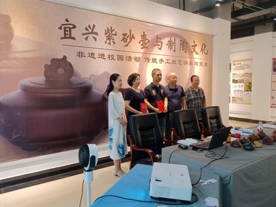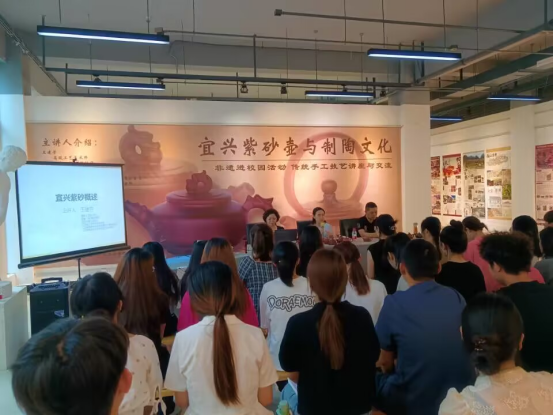 在欣赏环节,王建芳以自己创作的紫砂壶作品为例,从实用性、艺术性和文化内涵性三个部分对紫砂壶进行了深入的分析与介绍。现场使用带来的紫砂壶精品与师生共同欣赏互动,回答师生对紫砂壶手工艺的提问。本次讲座推动了非遗进校园活动的开展,促进了师生对传统手工艺的研究,推动了美术与艺术设计学院的学科建设和专业建设。