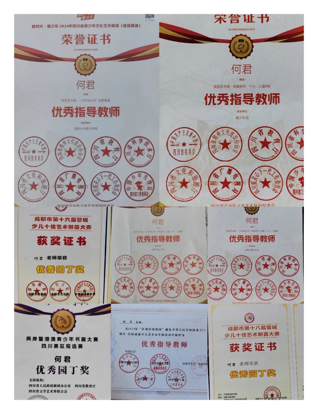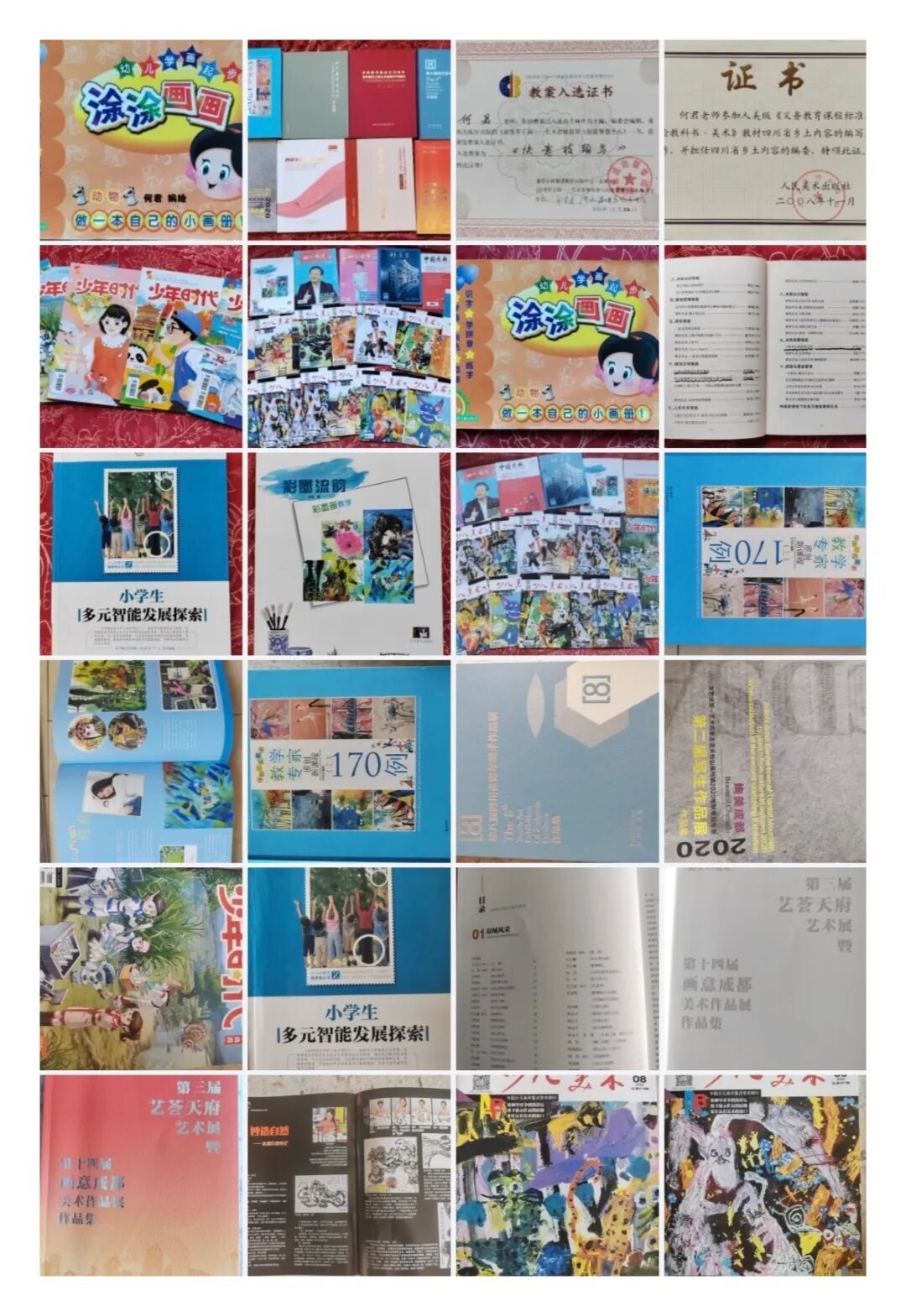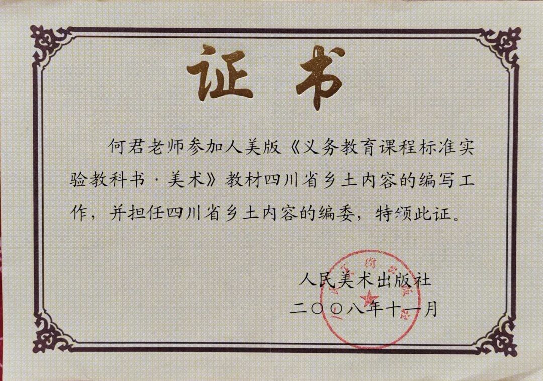 在艺术教育专家冯恩旭、左志丹等老师的指导下,何君老师参与编写全国中小学美术教材,先后出版《涂涂画画》《彩墨流韵》等教学专著,多篇论文获全国一等奖并在核心刊物发表。执教的课程拿下海峡两岸全国中小学美术教师录像课一等奖等多个奖项,负责的 “巴蜀乡土美育课程开发”写生实验课题,还获成都市青少年宫创新课程一等奖。受“创新育人”理念启发,她率先在青少年宫开设专家教师创新精品班,一批批学员在她的美育浸润下硕果累累、茁壮成长。