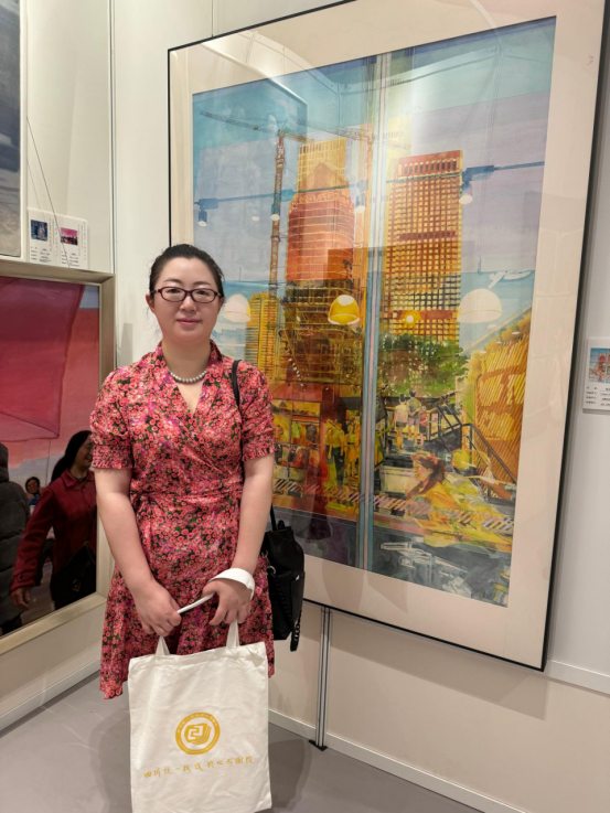 《建设生活》利用水彩材料,通过玻璃幕墙反射场景描绘城市建设与当下人民生活。画面中远处的高楼,近处抱着书的女子,外卖小哥和销售阿姨,与穿梭的车辆相融合,共同构成一幅流光溢彩又充满活力的当代城市生活场景。