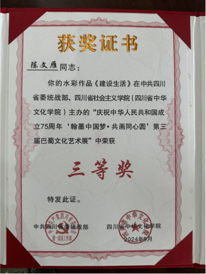 近日,由中共四川省委统战部、四川省社会主义学院主办的庆祝中华人民共和国成立75周年“翰墨中国梦·共画同心圆”第三届巴蜀文化艺术展在四川省社会主义学院开幕。学校党外知识分子联谊会会长、学院院长龚浩教授和教师黄彬副教授的雕塑作品《石破天惊》入展,学校民进委员会副主委、学院教师陈文雁副教授水彩作品《建设生活》荣获三等奖。